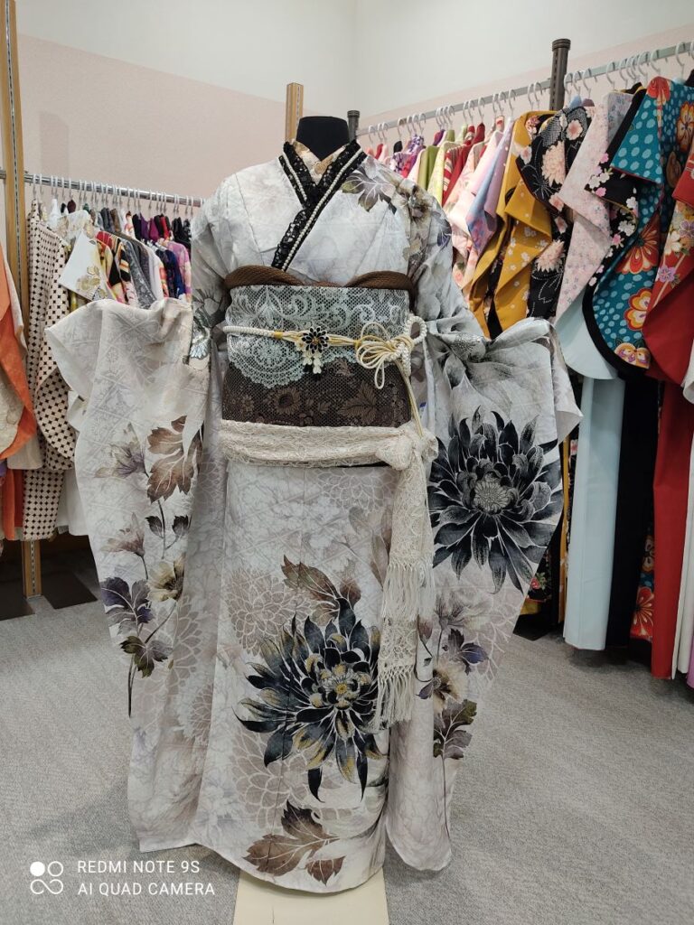 けれど重ね衿にパールやレース、お洒落に結んだシゴキもレース素材。そして帯もレース素材が使われており、カッコイイと可愛いの組み合わせはまさに『甘辛コーデ』ですね(*^^*)