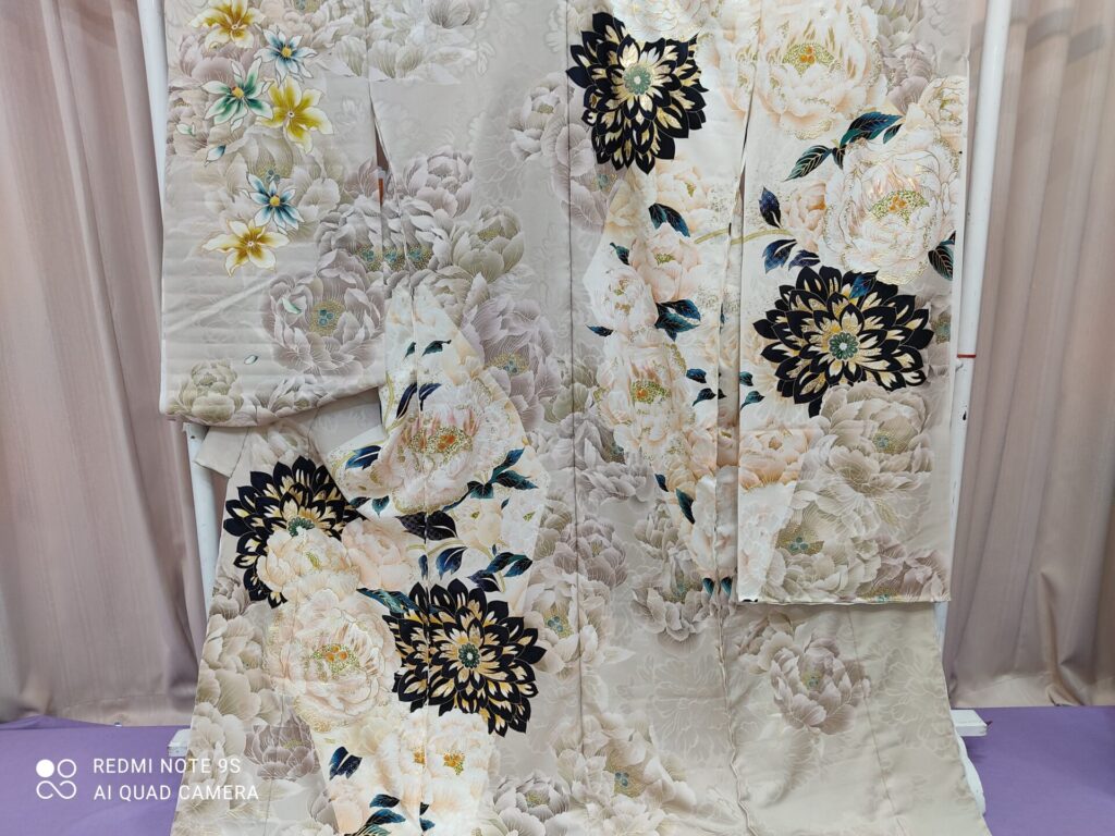 くすみカラーと言ってもたくさんありますがこちらのお振袖はベージュのくすみカラーの生地に白の牡丹の花と黒の菊の花のデザインです。牡丹と菊の花は大柄で大胆なデザインです!!「牡丹」の花は古くから「百花の王」と呼ばれています。牡丹の花はサイズが大きく大輪の花を咲かせます。花弁も上品で美しく、見とれるような魅力があります。こうした美しくきらびやかな見た目から牡丹は高貴や幸せを意味する花として着物の柄に多く使われています。「菊」の花は皇室の御紋にも使われている大変高価な花です。古くから菊は「邪気を払う縁起の良い花」とされており、無病息災・長寿のシンボルです。ぷっくり丸い形が可愛らしい万寿菊、華やかに大胆な柄として描かれること多い乱菊(らんぎく)など表現の幅が広いのも菊ならではです!!