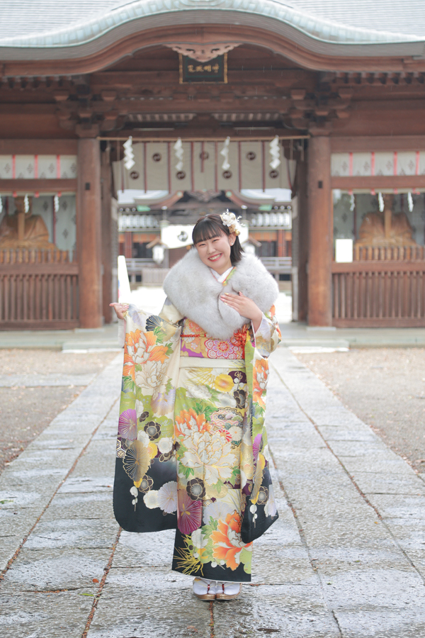 まずは、こちらの白い振袖をお召しになったお嬢様です。裾に向かって黒にグラデーションしていく色味が可愛いだけではない重厚感を演出してくれています。