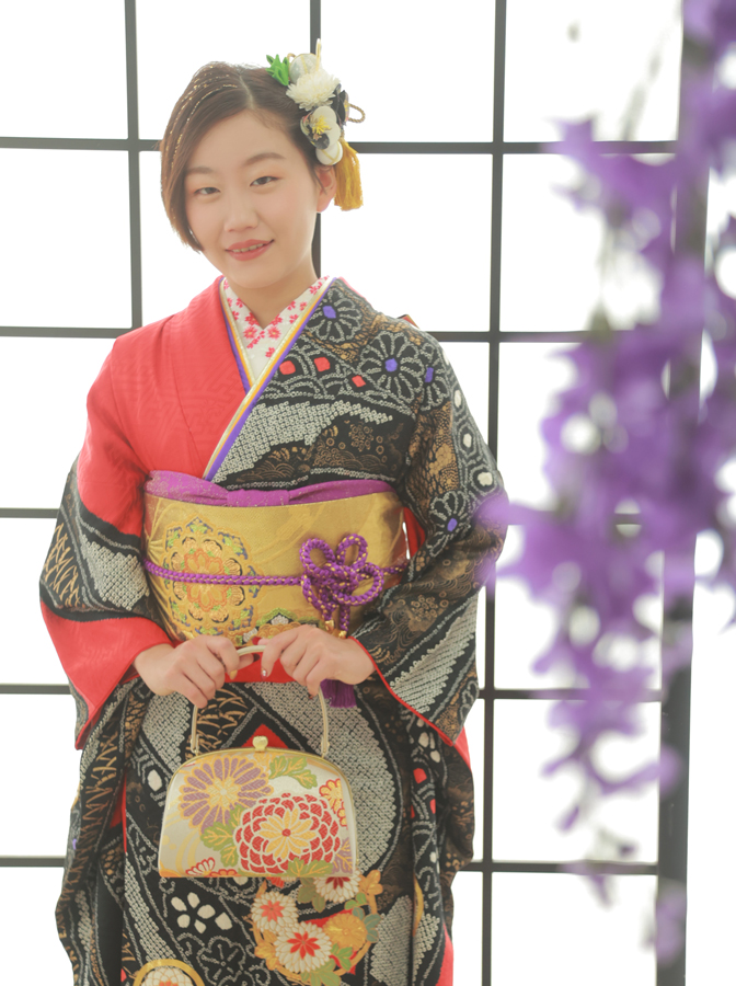 赤と黒のコントラストが素敵絞りの振袖がお似合いですね♪。ですが後ろに髪のポイントが来ない分髪飾りを顔の近くに持ってくることができます。
