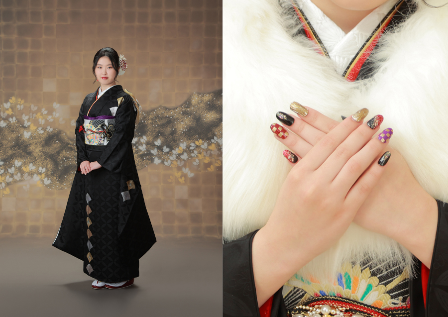 ・黒振袖×和柄ネイル