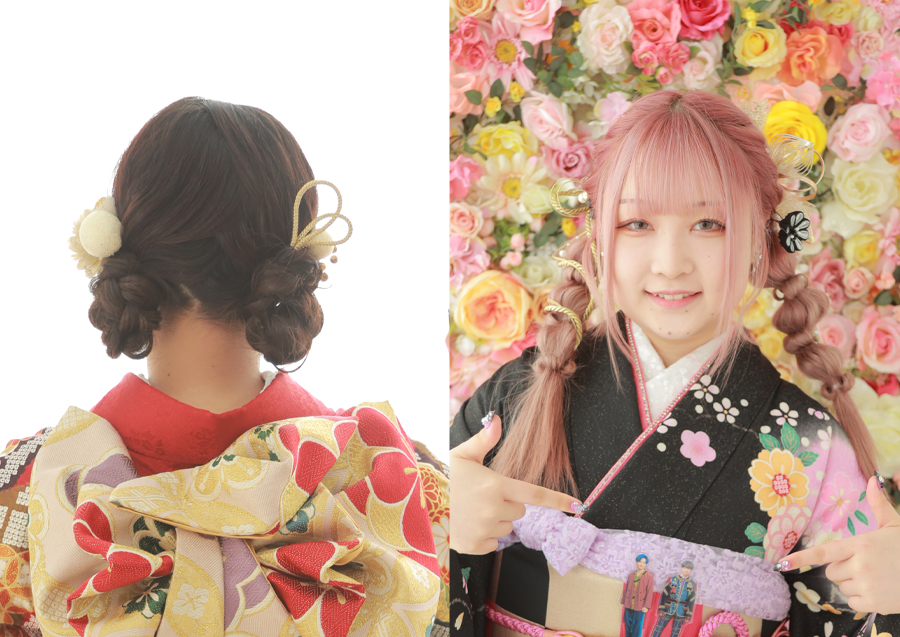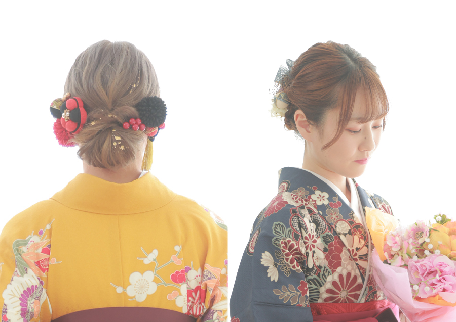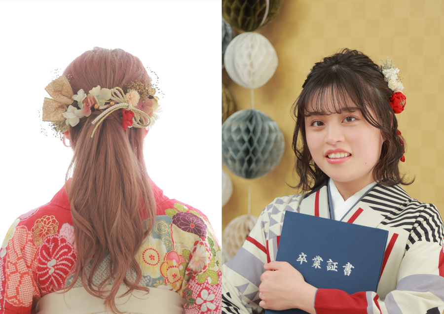 振袖と卒業袴は、同じ和装でも雰囲気が全然違いますよね。振袖の前撮り・成人式とは違うヘアスタイルに挑戦したり、成人式と卒業式で髪の長さを変えてそれぞれ違った雰囲気にしたりするのもおすすめです!