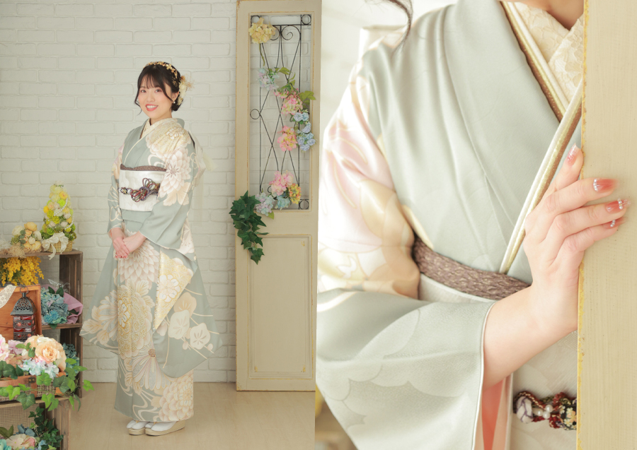くすみカラーは洋服やインテリアでも大人気ですが、振袖業界でも注目を浴びています!彩度が低めでグレーがかったような色をしているのが特徴で、柔らかく優しい雰囲気が印象的なカラーです♪