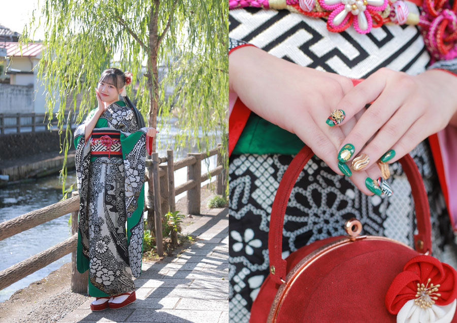こちらのお嬢様は、絞りの柄が素敵な緑の振袖と同じカラーのネイルをチョイスされました!
