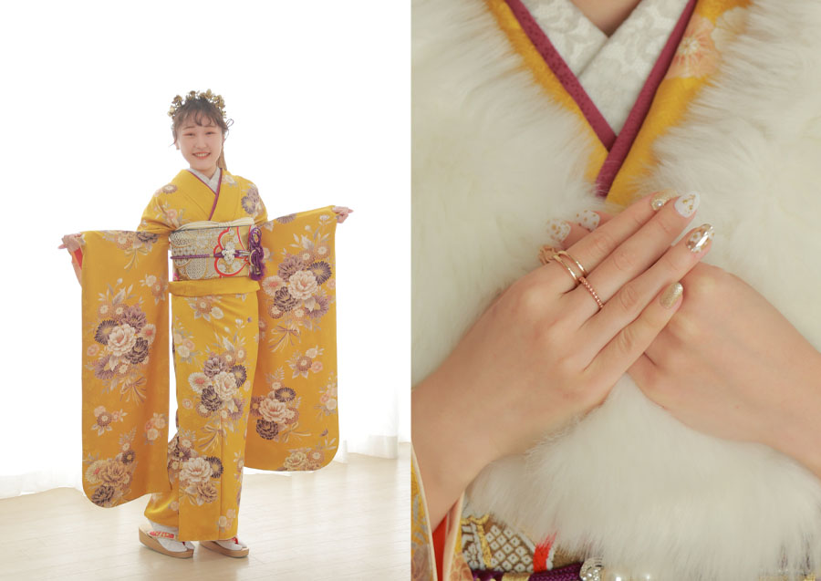 こちらのお嬢様は、からし色の振袖にホワイトとゴールドカラーのネイルをチョイスされました♡