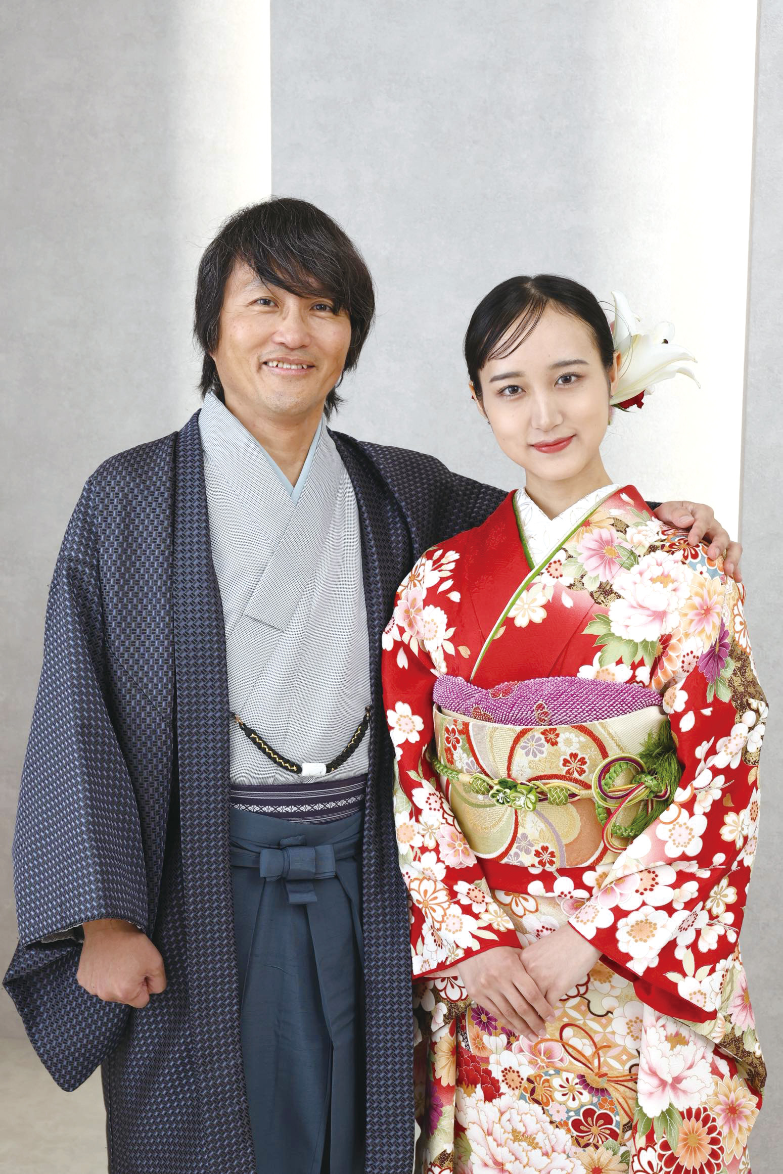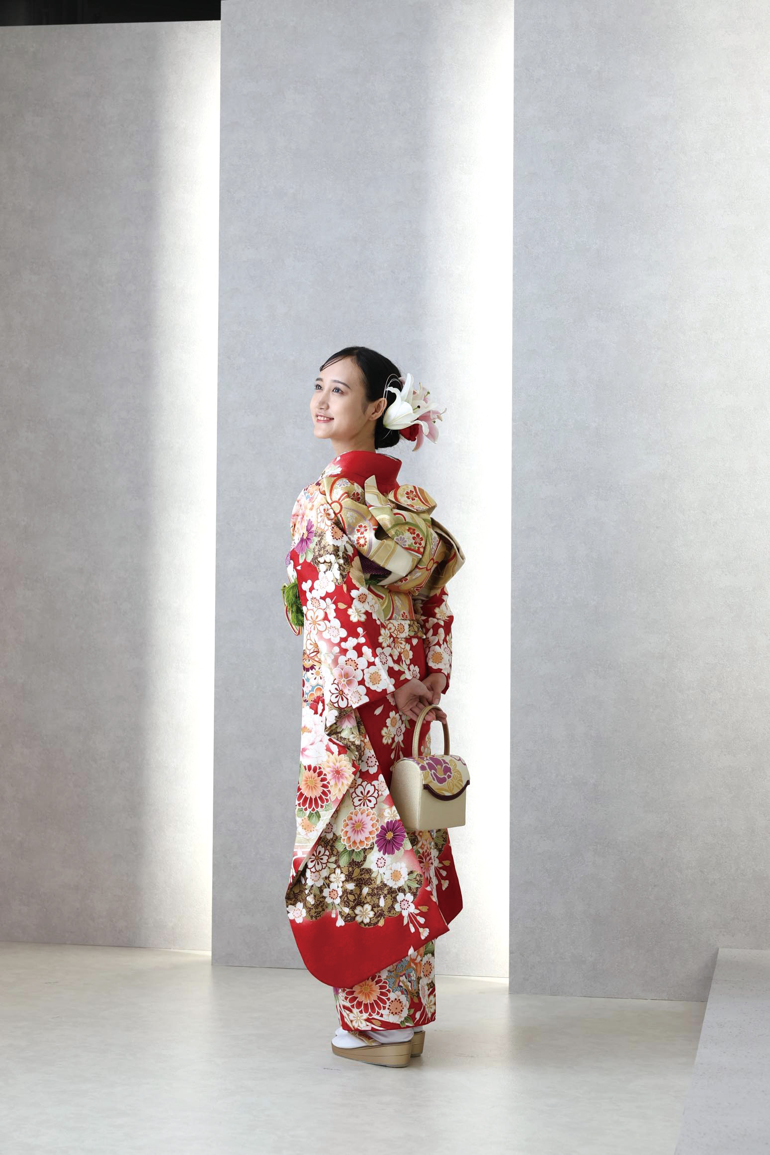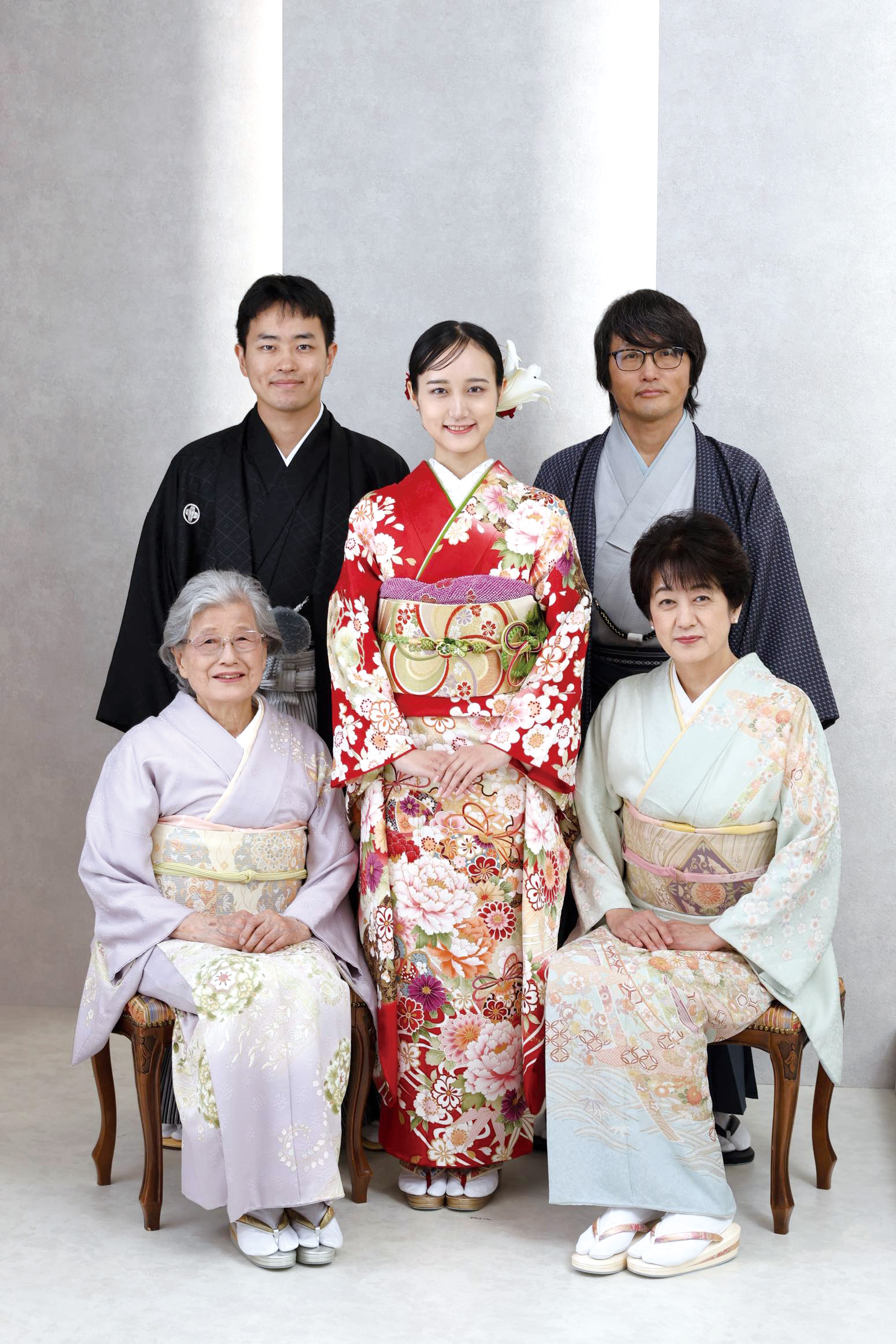 いろいろな振袖を合わせた結果、想像していた通り赤の古典柄が一番しっくりと来たというお嬢様。髪飾りにはカサブランカの生花を使用し、大満足だったそうです。「家族全員で着物姿になるのは初めてのことで、貴重な経験になり、みんなで楽しめた前撮りでした!」。