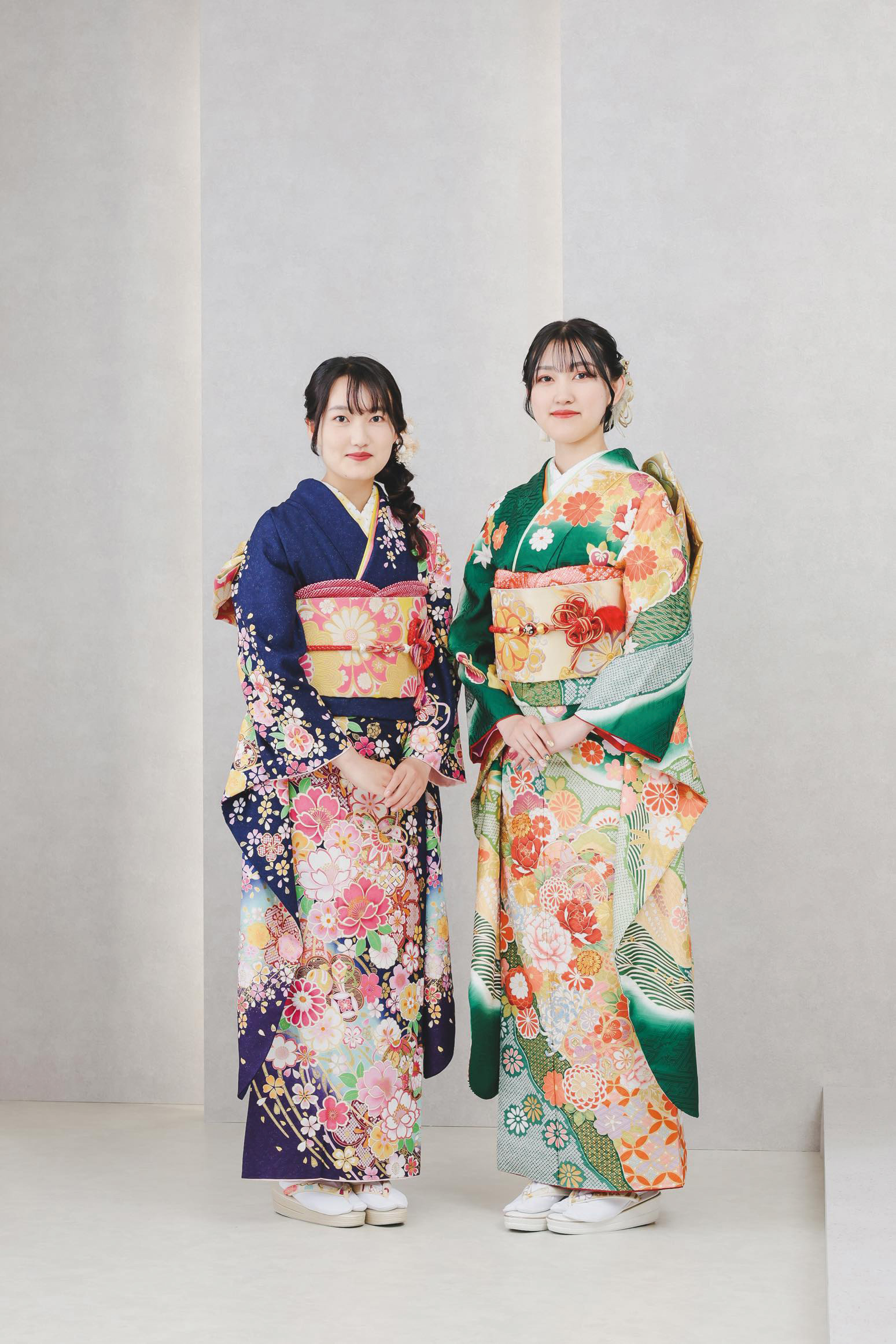 グリーンの振袖を上品に着こなしたお嬢様。妹さんと寄り添い幸せそうです。「前撮り直前に妹も参加できることになり、二人で振袖姿とドレス姿とで撮影をしました。姉妹で楽しそうにする姿を見て、好きなようにさせてあげられて良かったなと思いました」とお母様です。