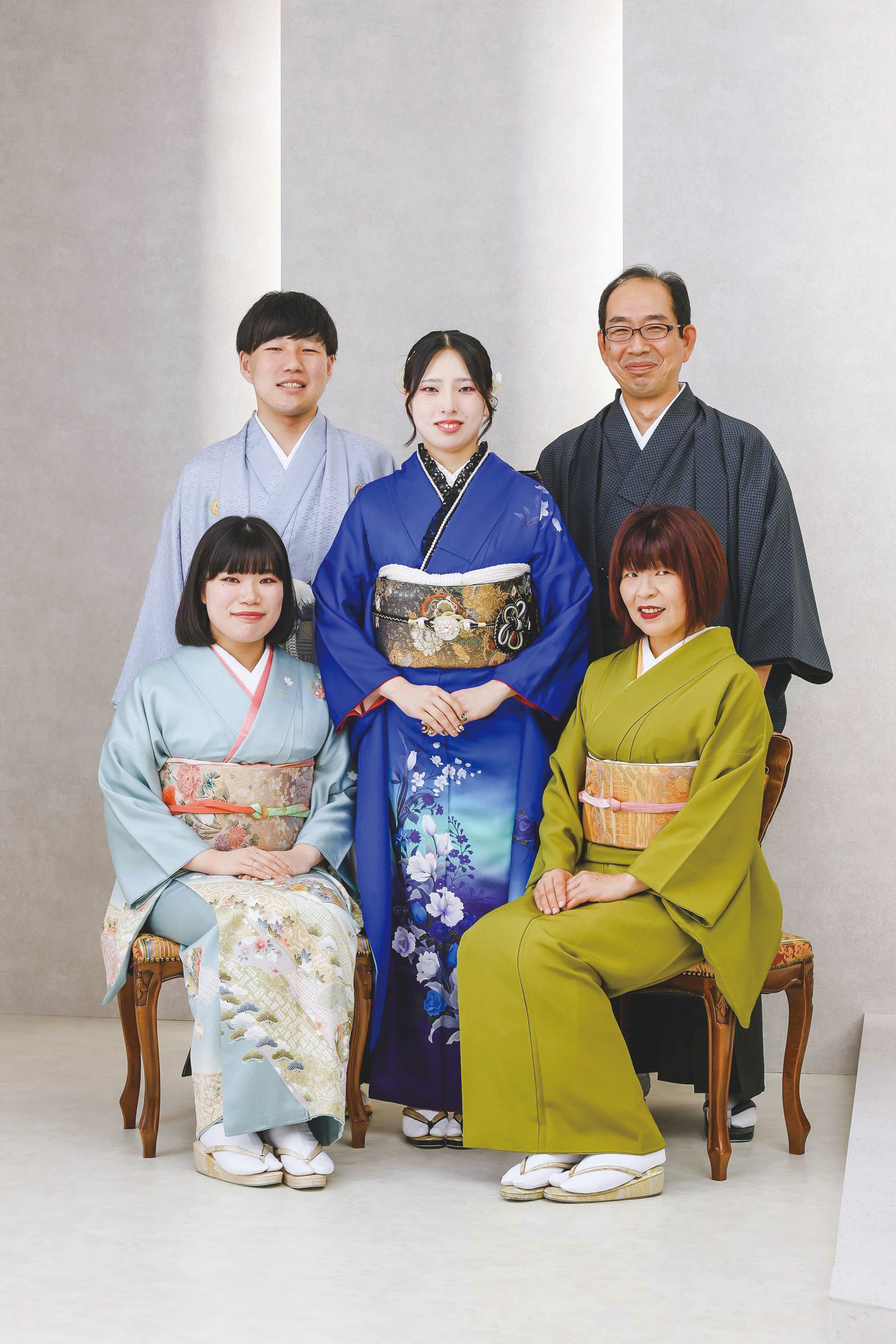 ネオクラシックな振袖姿のお嬢様、ご家族と幸せショットです。お母様の振袖を着た姿はカッコ良さが際立ちました。「メイクをして、ゆるふわヘアにしてもらうと雰囲気が変わり、別人のようでした」とお母様。妹さんもきもの姿になり、良い経験になったそうです。