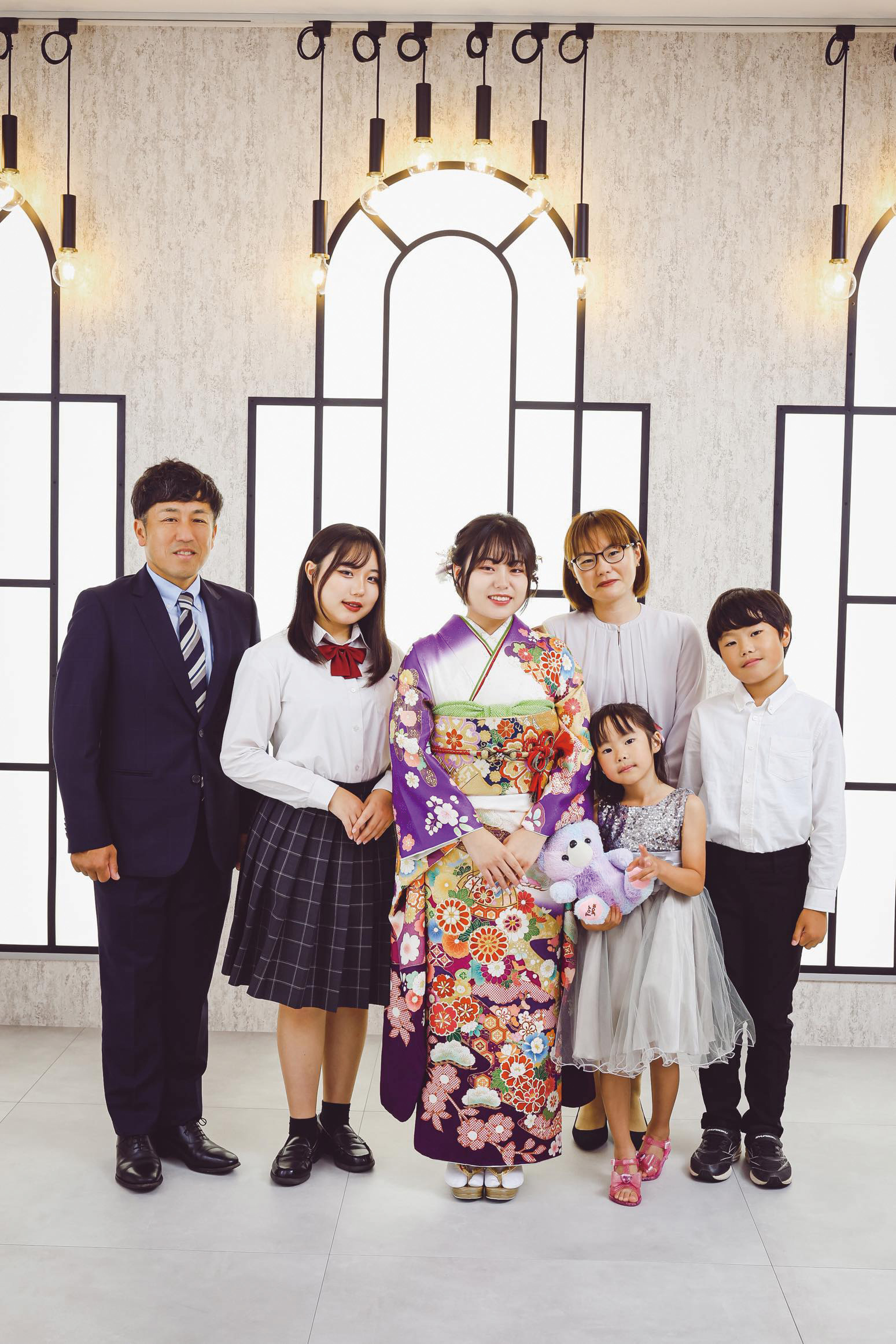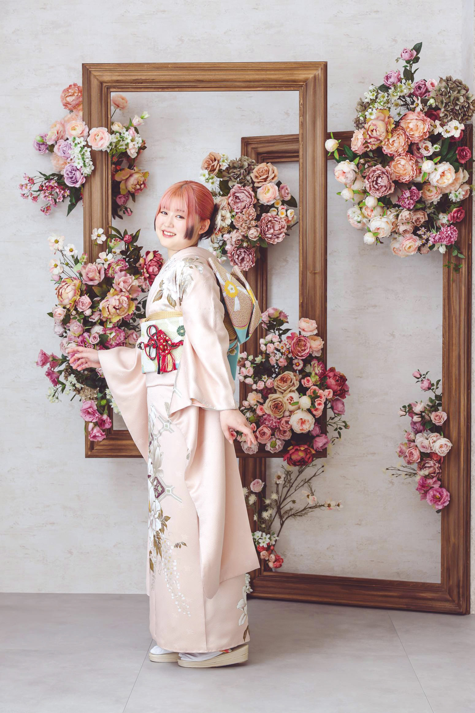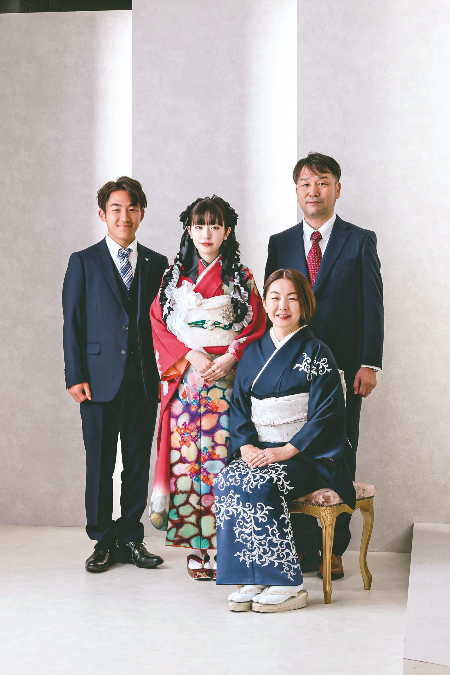 振袖に合わせたピンク&ダークグレーの髪色もお似合い。オシャレを楽しまれました。「感動しました!七五三以来のきもの姿で、そのときからの成長を感じ、思わず涙ぐんでしまいました」とお母様。大切な節目に家族写真が残せたことにも感無量のご様子でした。